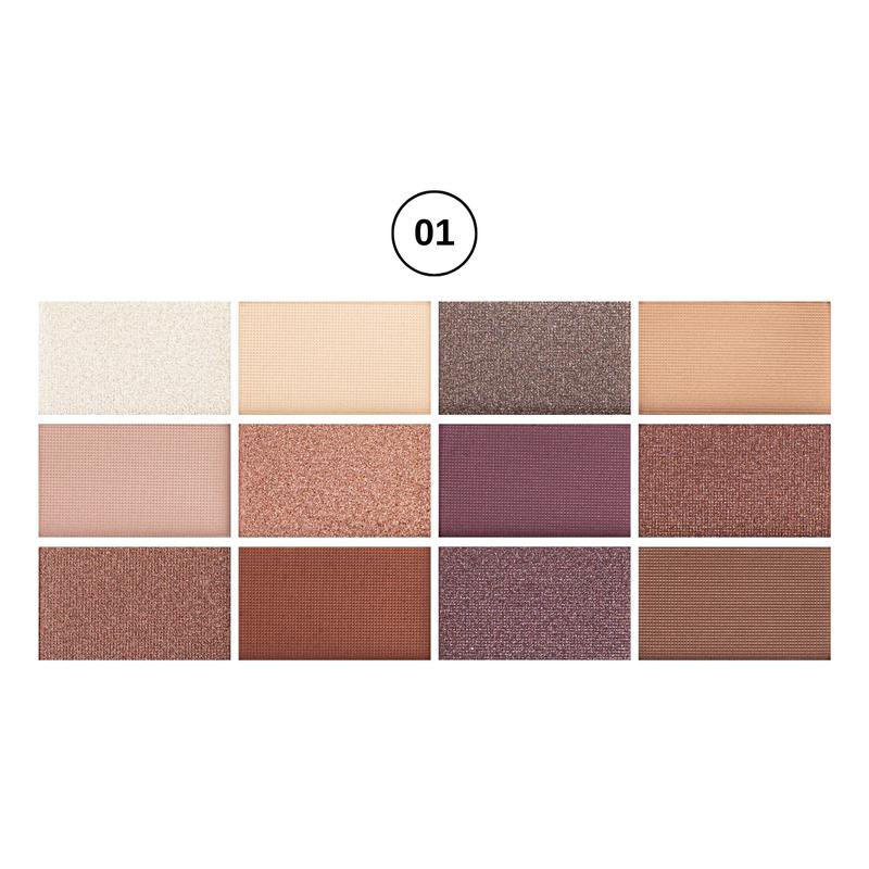 Палетка теней из 12 оттенков включает матовые и шиммерные текстуры. Тени имеют