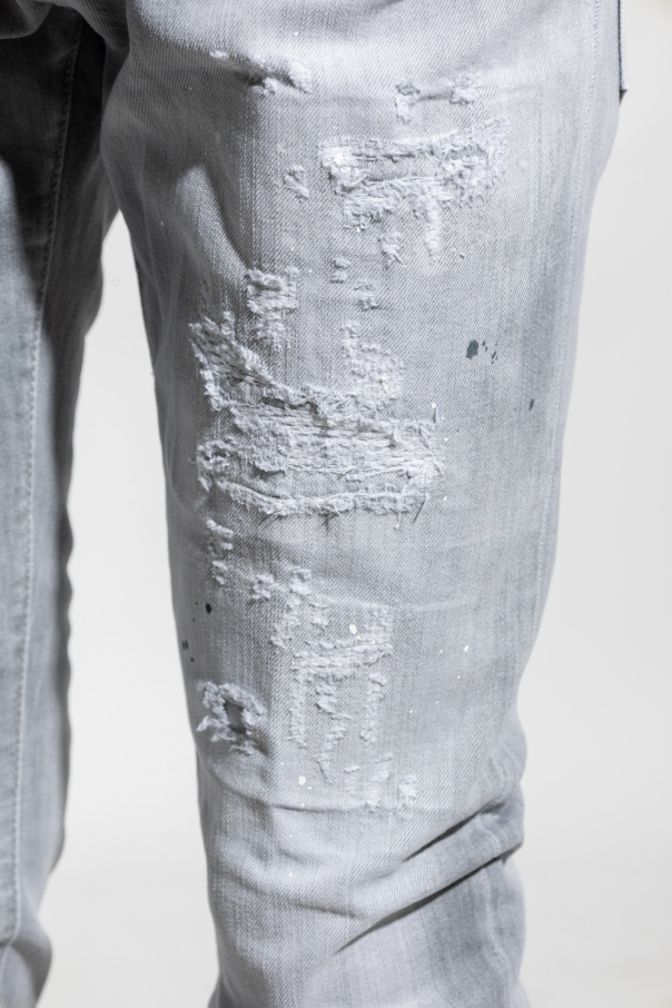 Grey ‘Skater’ jeans from Dsquared2. Crafted from cotton with a vintage effect, this pair falls with tapered legs and features button fastenings, classic five pockets, paint splatters and a black logo patch at the back.