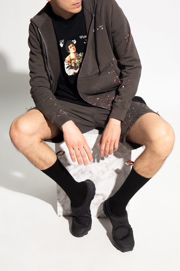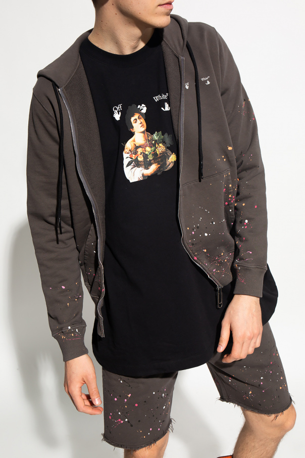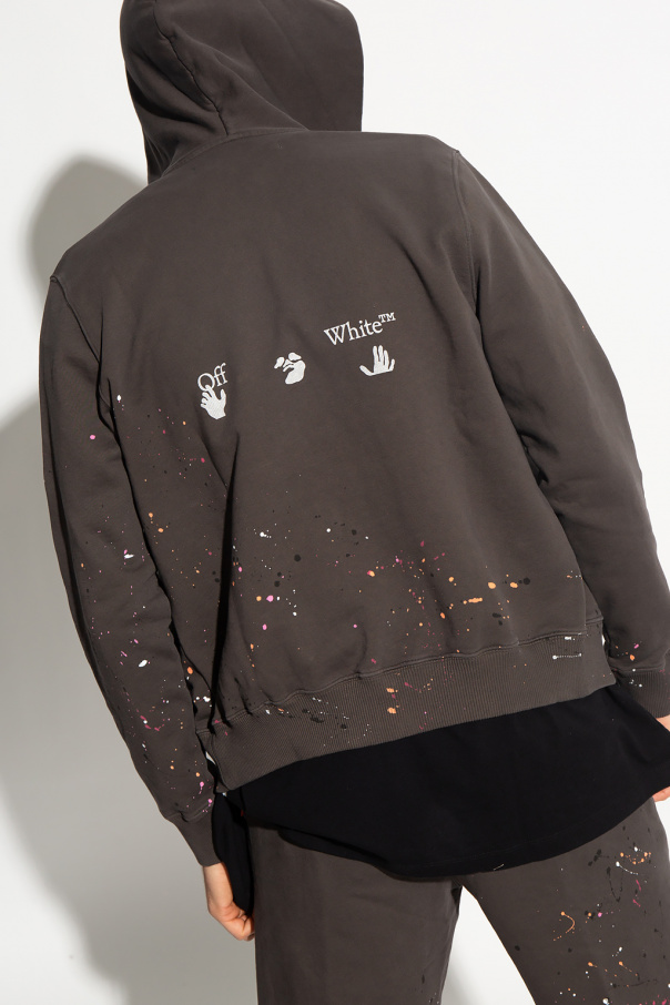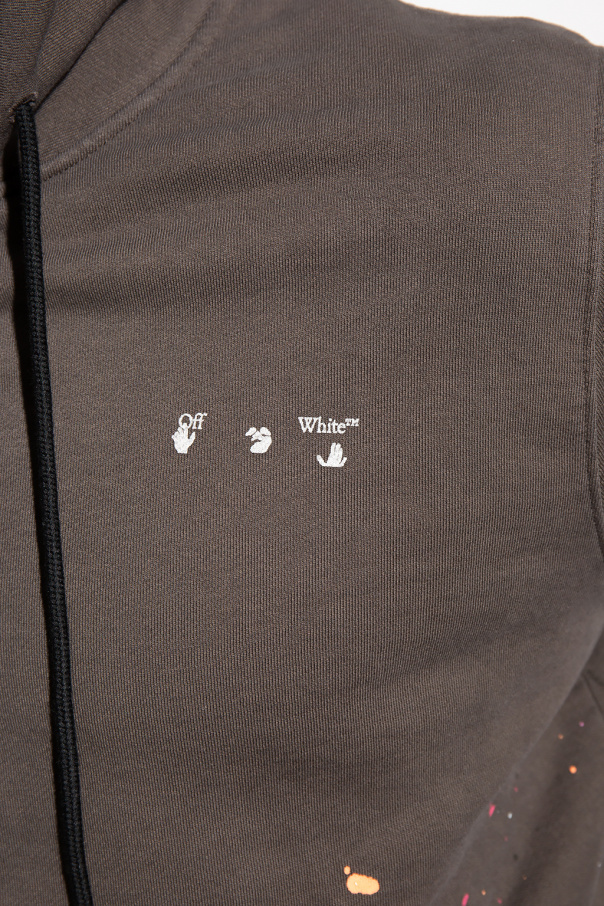 Brown hoodie from Off-White. Fastened with an asymmetrical zip, this garment features a logo print, paint splatter effect, two zip pockets and ribbed trims.