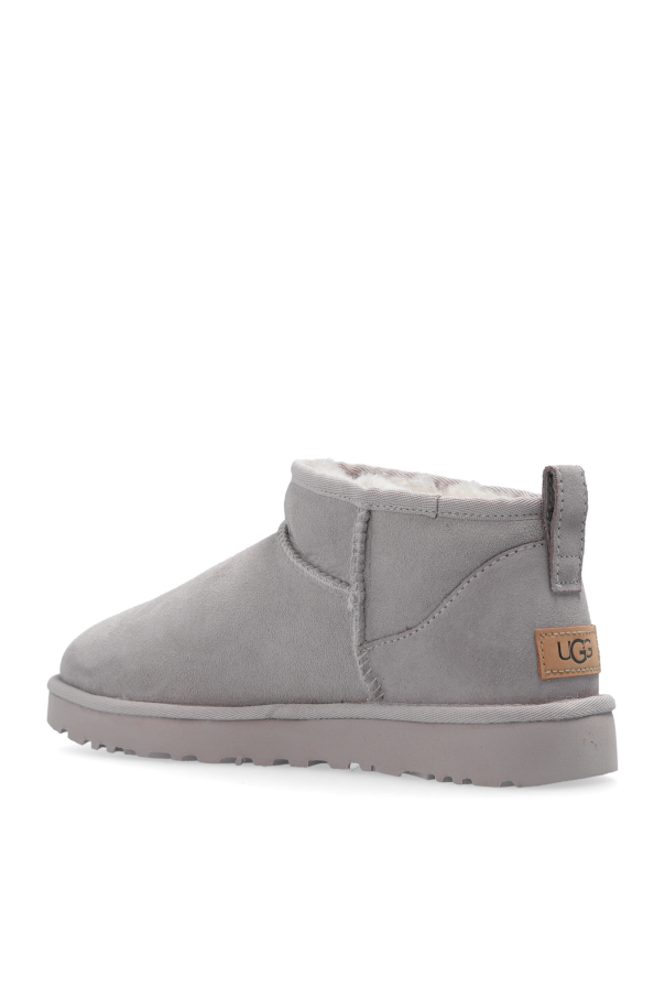 Introducing the Classic Ultra Mini ankle boots by the esteemed brand UGG, a paragon of luxury and comfort. These exquisite boots, rendered in a captivating violet hue, epitomize both sophistication and practicality. Expertly crafted from premium suede, the outer layer of these boots exudes a soft, plush texture. The interior is lined with sumptuous fur, likely wool, ensuring unparalleled warmth and coziness. The robust rubber sole, adorned with a pronounced tread, guarantees exceptional traction on slippery surfaces. The design is elegantly minimalist, featuring a low-profile \"ultra mini\" shaft that sits just below the ankle, making these boots a versatile addition to any wardrobe. A discreet brown logo patch embellishes the heel, a testament to the brand\'s storied heritage. Meticulous stitching further accentuates the impeccable quality of this footwear. Why Purchase This Product? Superior Comfort: Luxurious fur lining for ultimate warmth. High-Quality Materials: Crafted from premium suede and durable rubber. Stylish Versatility: Elegant violet color and low-profile design. Exceptional Traction: Sturdy rubber sole with a pronounced tread. Renowned Brand: Proudly featuring the UGG logo, a symbol of excellence.