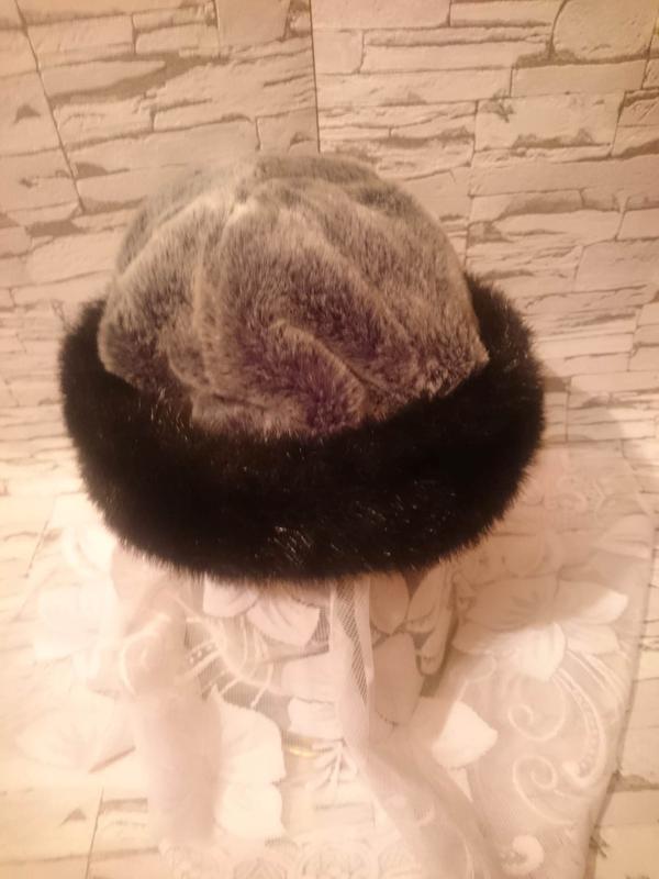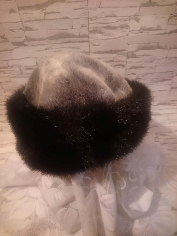 Зимняя шапка из искусственного меха светло-серого цвета с черной окантовкой и светло-серой подкладкой.