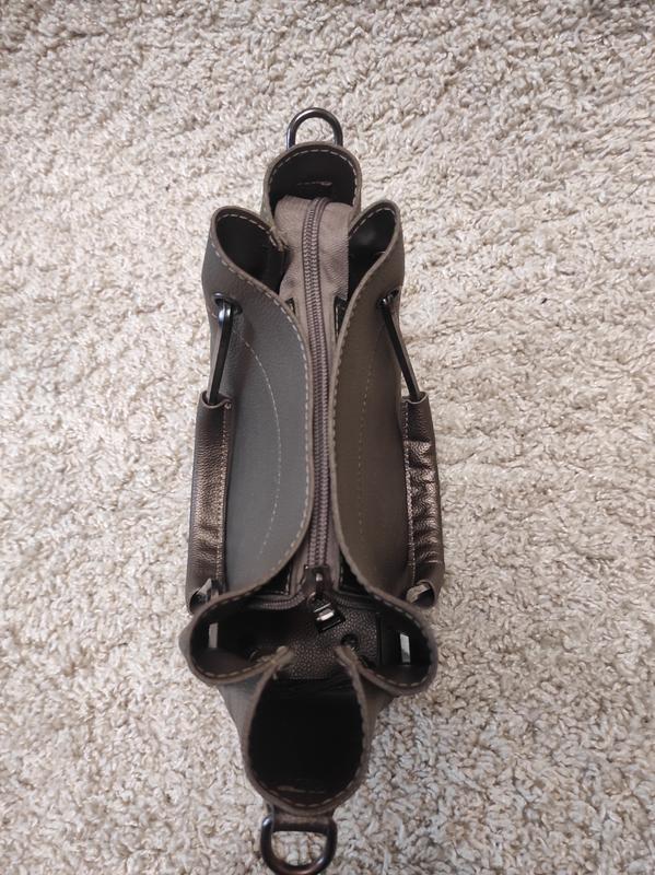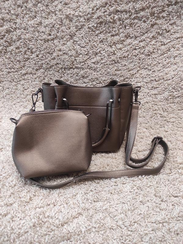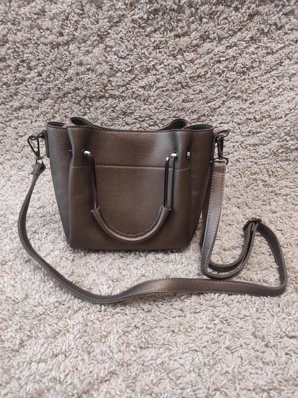 Стильная сумка бронзового цвета, в идеальном состоянии. Изготовлена из эко-кожи (материал максимально напоминает кожу). Открывается с помощью молнии. Сумка без подкладки. Высота сумки 18см, длина этажа 23 см, длина дна сумки 20 см, ширина дна сумки 11 см. В комплекте идет косметичка на молнии, которую по желанию можно вынуть, также на косметичке есть крепление для ремешка. Размер косметички: длина 16 см., ширина 8 см., высота 15 см. Сумка имеет железные ручки для ношения в руке (высота ручек: 14 см.), и съемный ремень для ношения на плече, длина ремешка в полностью развернутом виде 130 см, ремешок регулируется.
