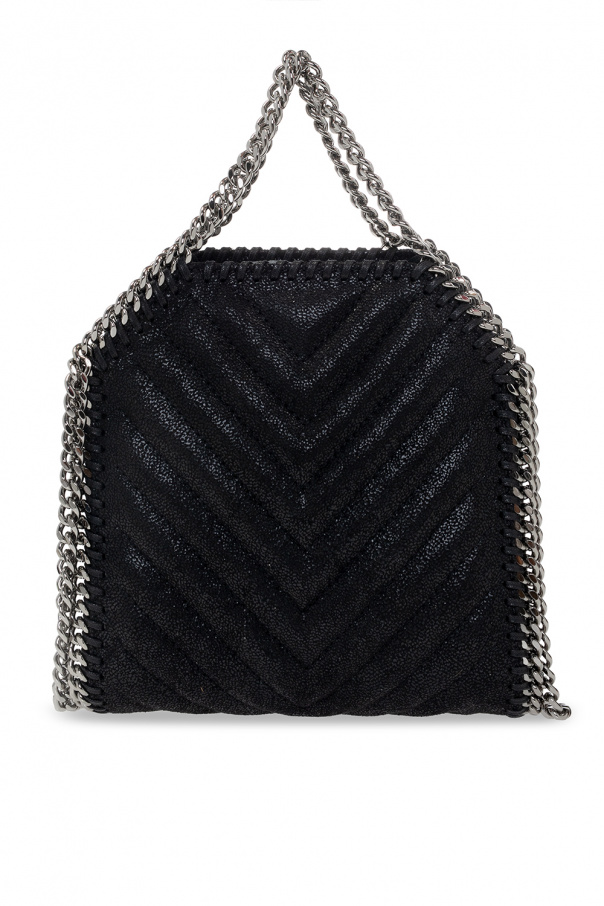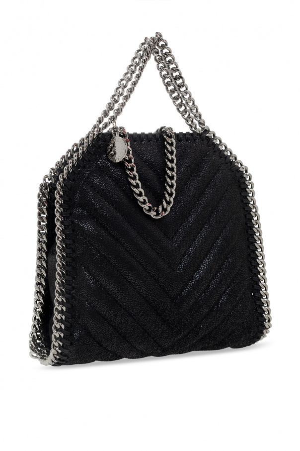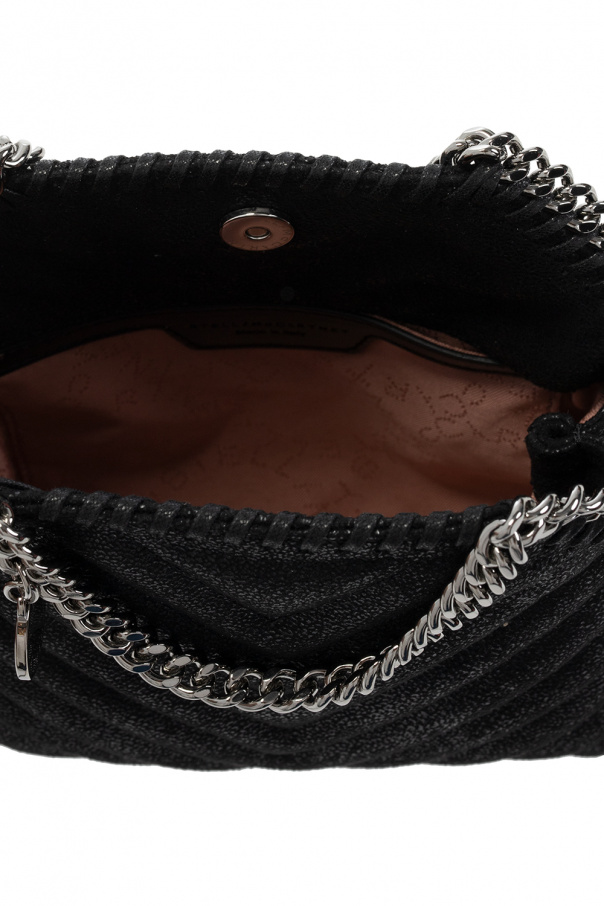 Black ‘Falabella Tiny’ quilted shoulder bag from Stella McCartney. Crafted from faux-suede, this design fastens via a magnetic snap and showcases chain trimming, exposed stitching details, a round charm with an embossed logo on the side, two half-round handles, a chain shoulder strap, silver-tone metal hardware and a pink-clad interior with one compartment and one slip pocket.