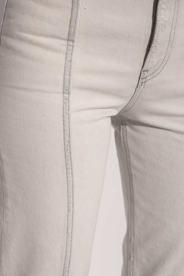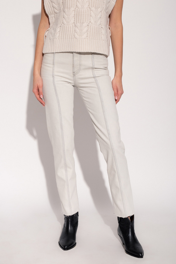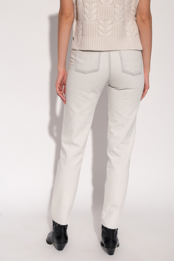 Light grey jeans from Iro. Made of cotton with a slim-fit, this pair features a zip fly with a button, four slip pockets, distressed detailing and raw-cut hems.