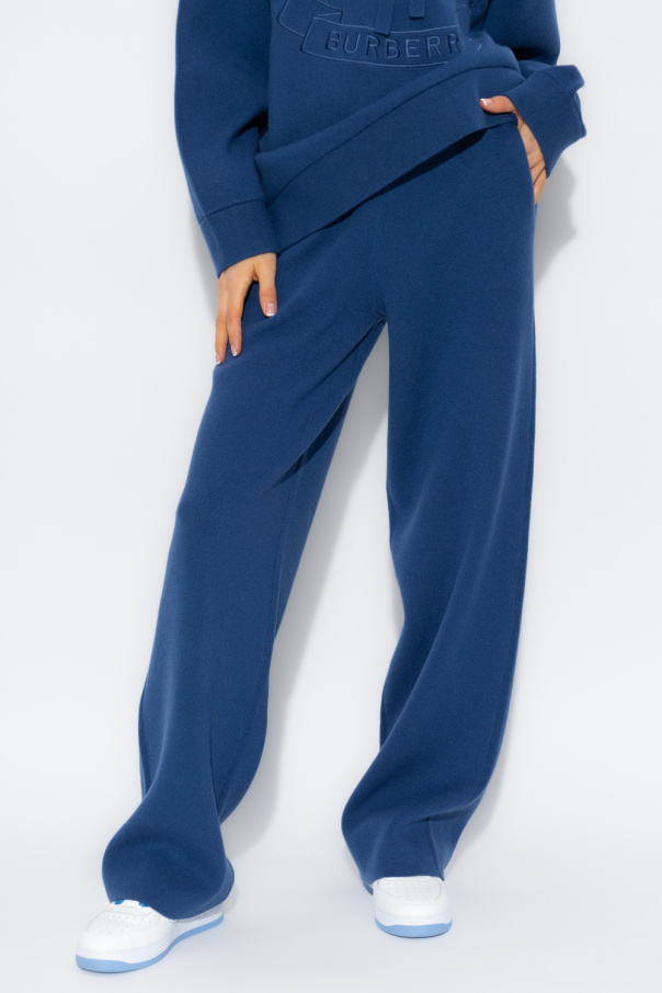 Blue trousers from Burberry. Crafted from cashmere, this pair falls with wide legs and features an elasticated waistband, two slip pockets and logo embroidery.