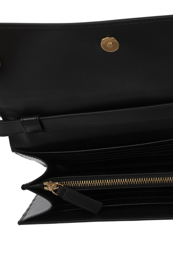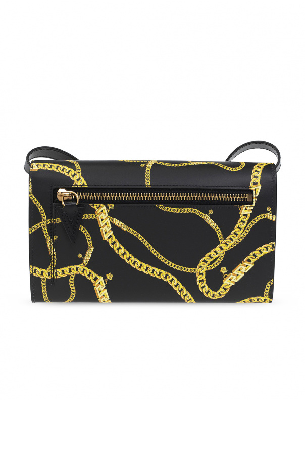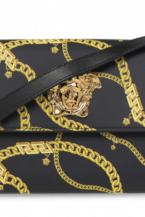 Black ‘La Medusa’ wallet from Versace. Fastened with a magnetic closure, this item is enriched by a Medusa head and chain motif, La Greca pattern in yellow and brown as well as a gold-tone Medusa head on the flap. It is complete with a detachable shoulder strap, back zip pocket and one internal compartment with a zipped partition, two slip pockets and sixteen card slots.
