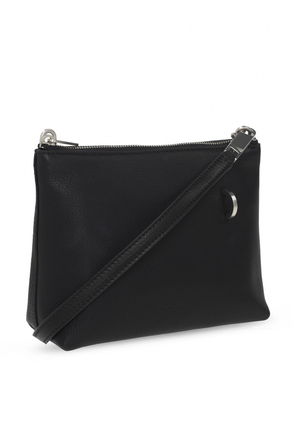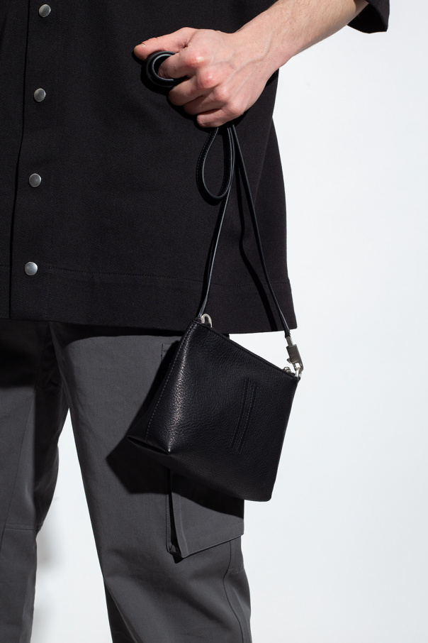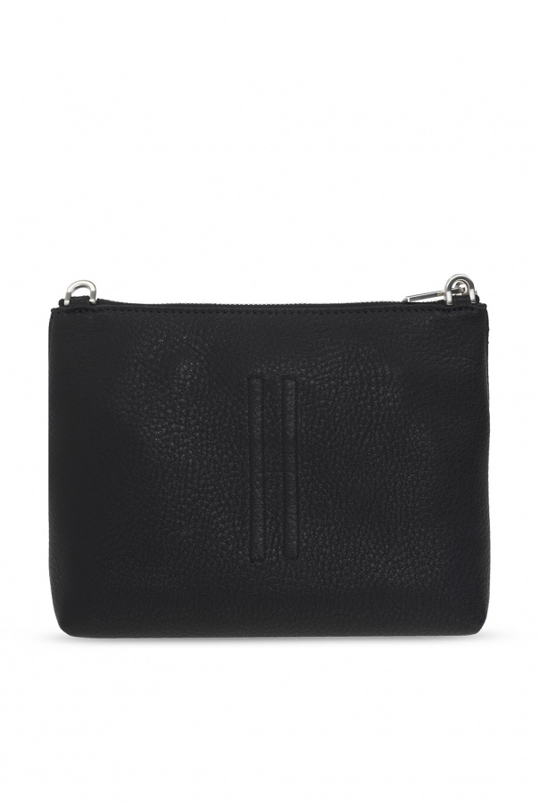 Black shoulder bag from Rick Owens. Made of leather, this model fastens with a zip and is decorated with a metal appliqué and embossed logo. It has a detachable and adjustable strap, silver-tone metal hardware and one internal compartment with one slip pocket.