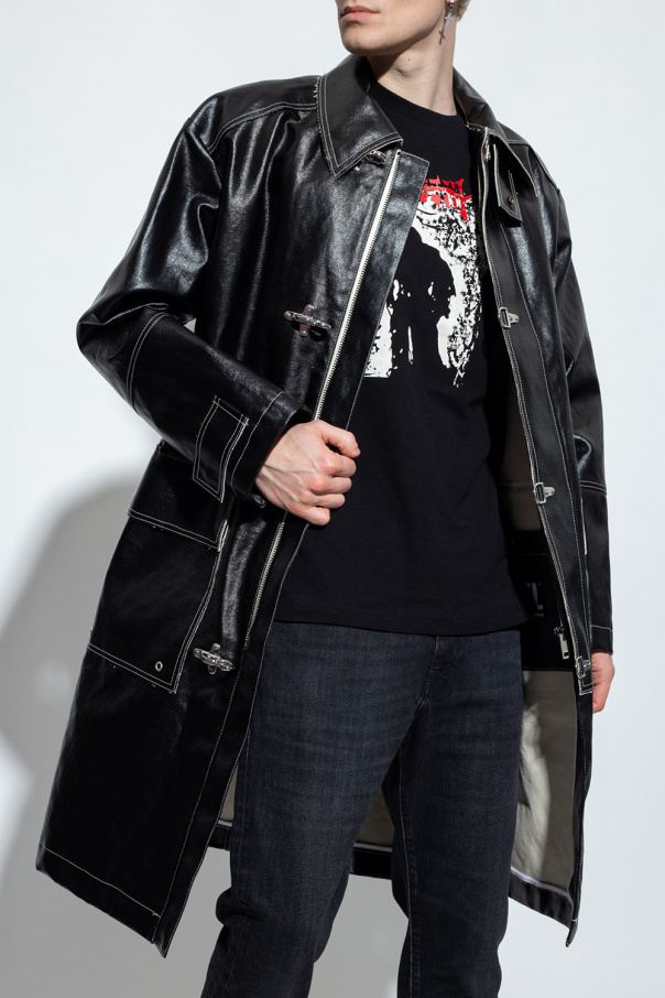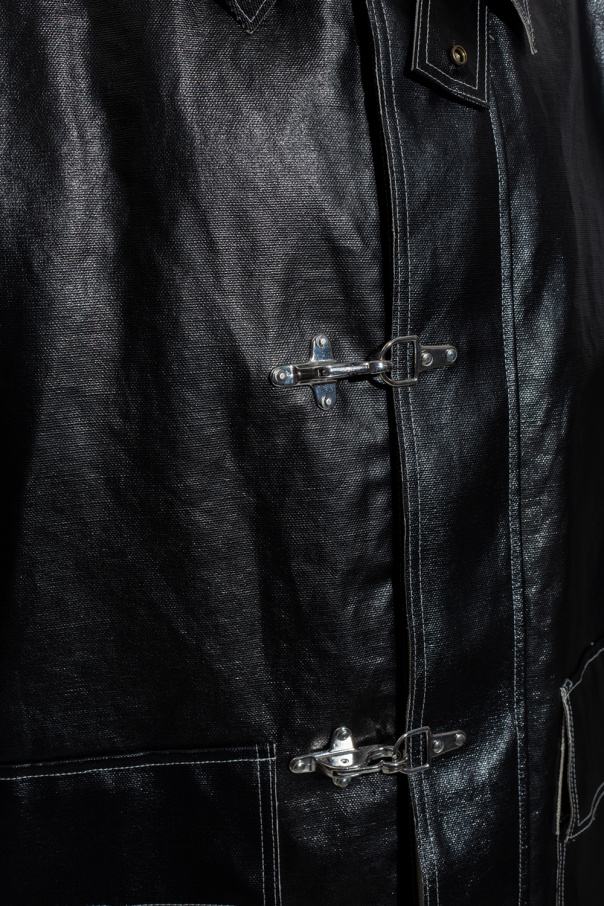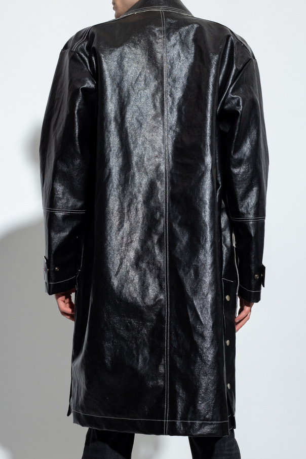Black ‘J-Fire’ coat from Diesel. Made of a coated cotton and linen blend, this garment features white stitching details, metal zip and clip fastenings with a concealed placket, two snap-fastened flap pockets, silver-tone metal hardware and decorative raw trims.