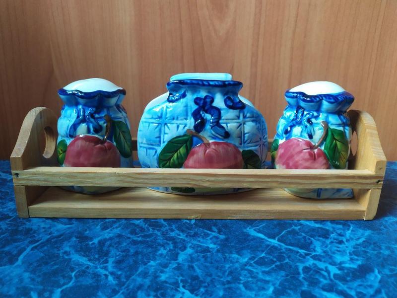 Набор солонка, перечница, салфетница на деревянной подставке "Яблоки".