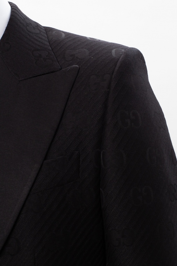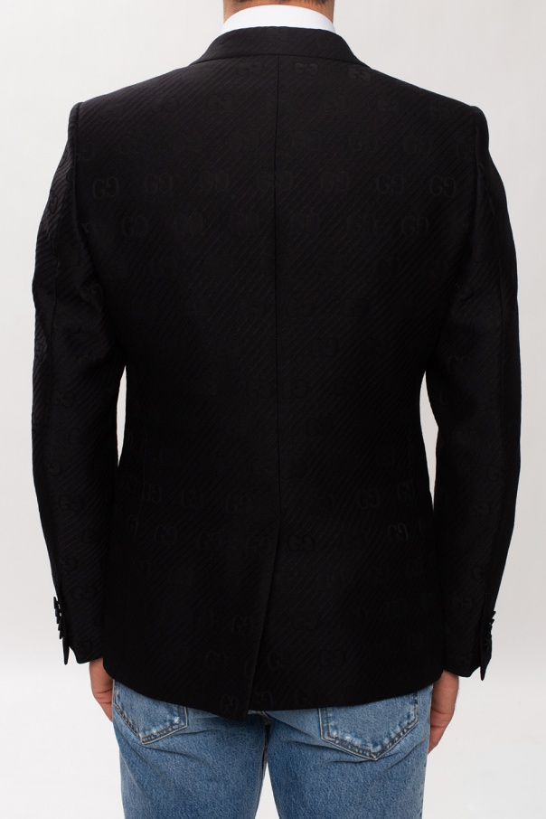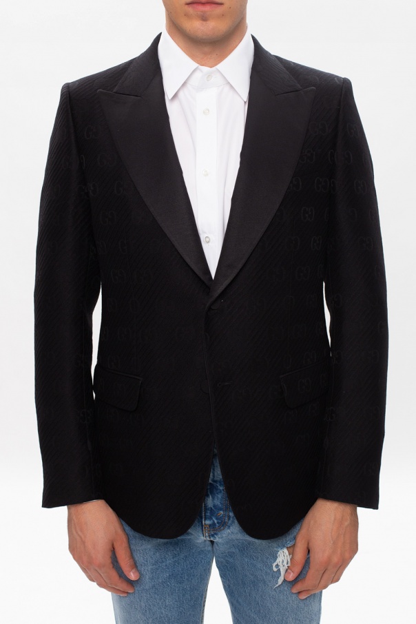 Black blazer with peak lapels from Gucci. Fastened with buttons, this garment features an embroidered logo pattern, two front flap pockets and a single rear vent.