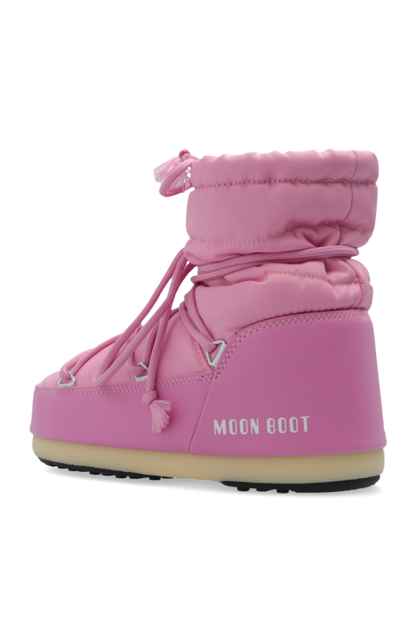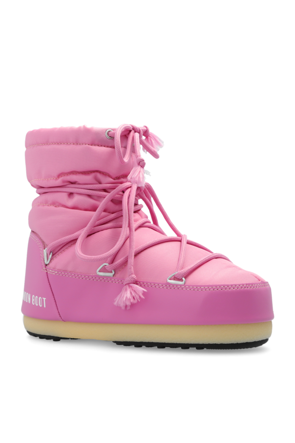 Pink ‘Light Low Nylon’ waterproof snow boots from Moon Boot. Printed with the brand\'s logo in white, this model sits on a black and cream tread rubber sole with suction cups to ensure superb grip on any surface and features double lace-up detailing on the front. Inspired by the peculiar shape and technology of the astronauts’ boots, the iconic style was designed in 1969 after the first Moon landing.