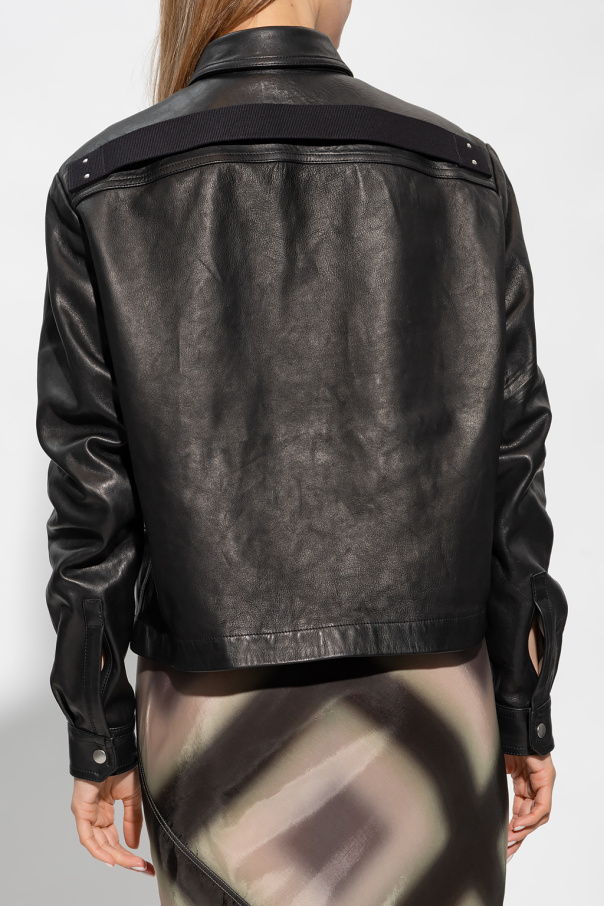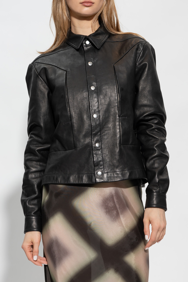 Black jacket from Rick Owens. Made of lamb leather, this design features silver-tone branded snaps, collar, two snap-fastened front pockets, long sleeves with snap-fastened cuffs and black fabric strap at the back.