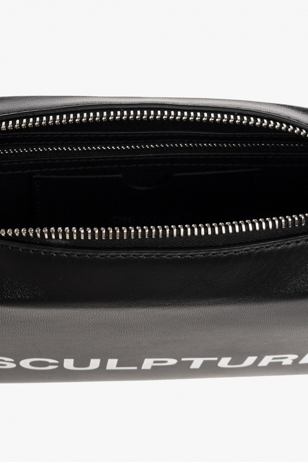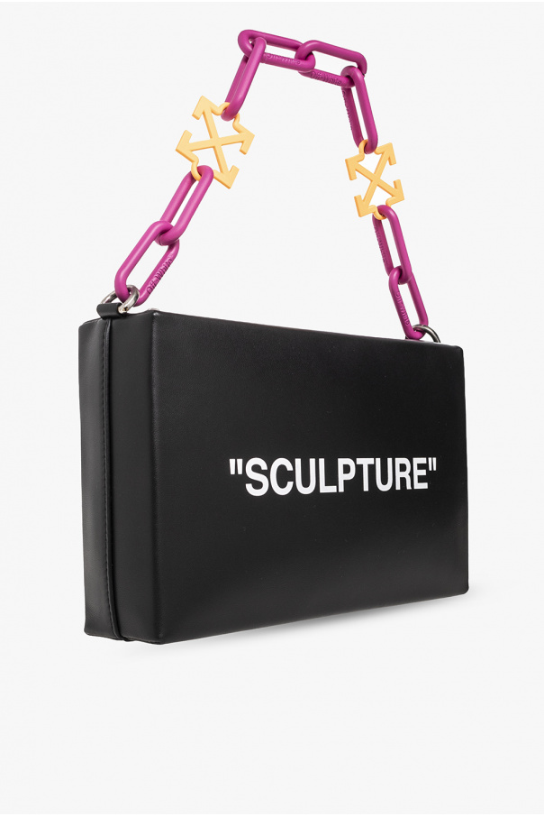 Square, black ‘Block’ handbag from Off-White. Made of lamb leather, this model fastens with a zip and is enriched by a white logo on the front and print at the back. It is complete with a decorative pink and orange chain with the brand’s signature arrow charms, silver-tone metal hardware and one internal compartment with one card slot.
