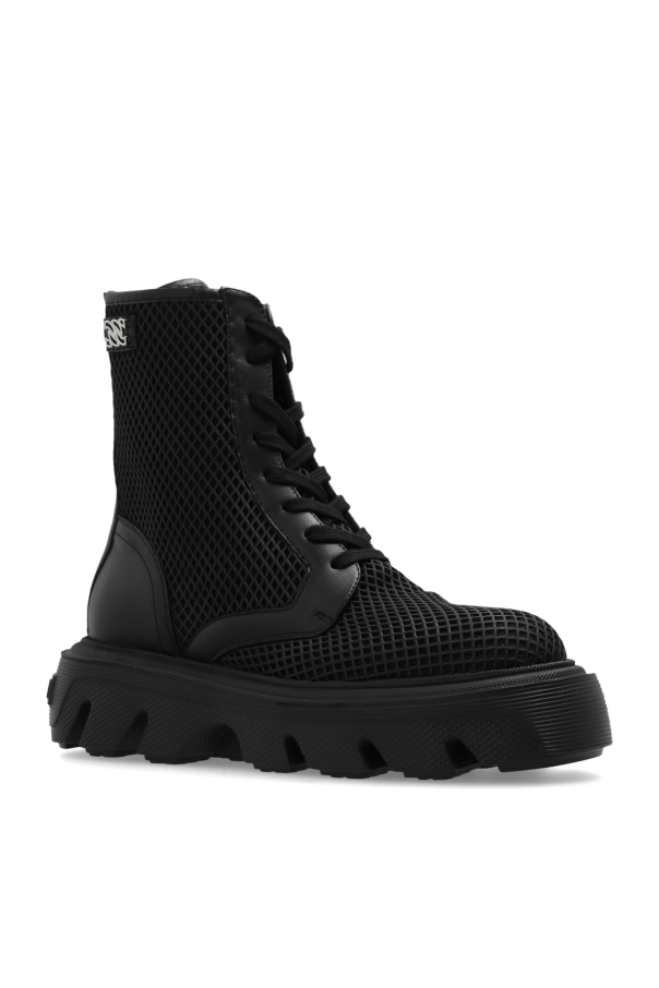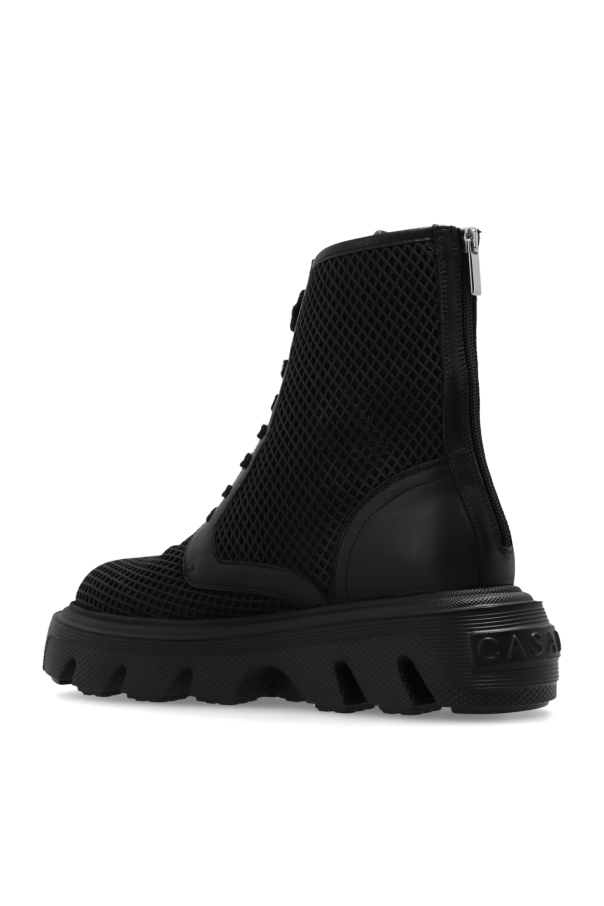 Black combat boots from Casadei. Made from leather and mesh, this lace-up model sits on a black rubber sole and features a zip on the back and a metal logo application on the side.