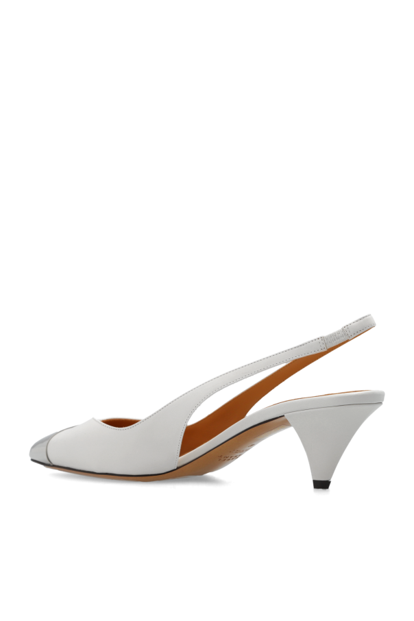 Light grey ‘Elina’ pumps from Isabel Marant. Made of smooth leather with a pointed-toe silhouette, this model sits on a beige leather sole and features an open heel and silver-tone metal hardware on the toe.