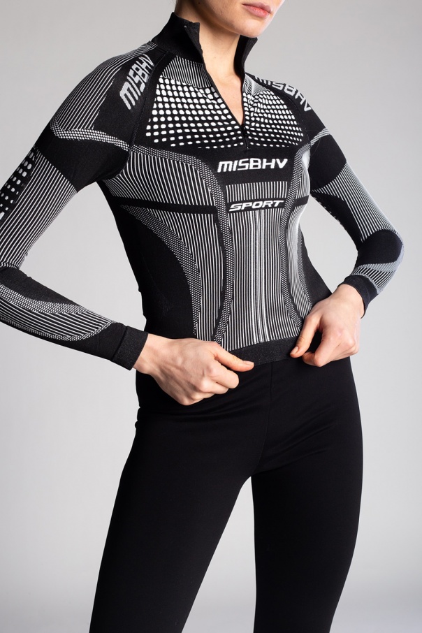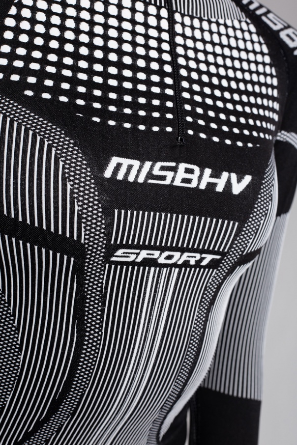 Black and white ‘Sport Active’ top with long sleeves from MISBHV. Crafted from breathable thermo-active fabric. 60% of the yarn is recycled. The garment features a white logo detail, zip fastening and ribbed trims at the hem and cuffs. This product was made in Poland with the use of 100% energy from solar panels.