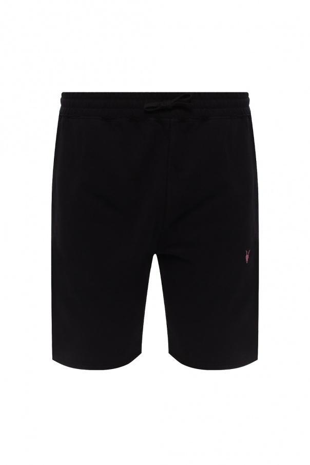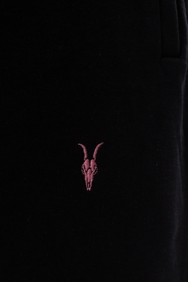 Black ‘Pheonix’ sweat shorts from AllSaints. This item features an elastic waistband with drawstrings, pink Ramskull embroidery and two slip pockets on the front.