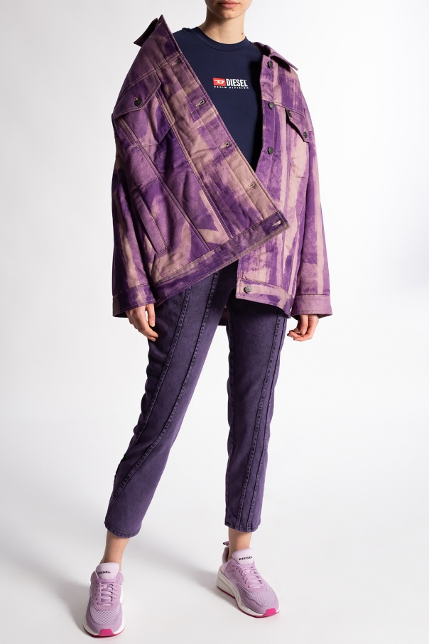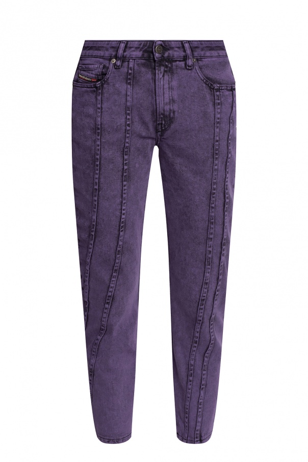 Purple ‘D-Joy’ jeans from Diesel. Crafted from stretchy cotton denim with a slim fit, this five-pocket design features a zip fly with a button, and exposed stitching details.