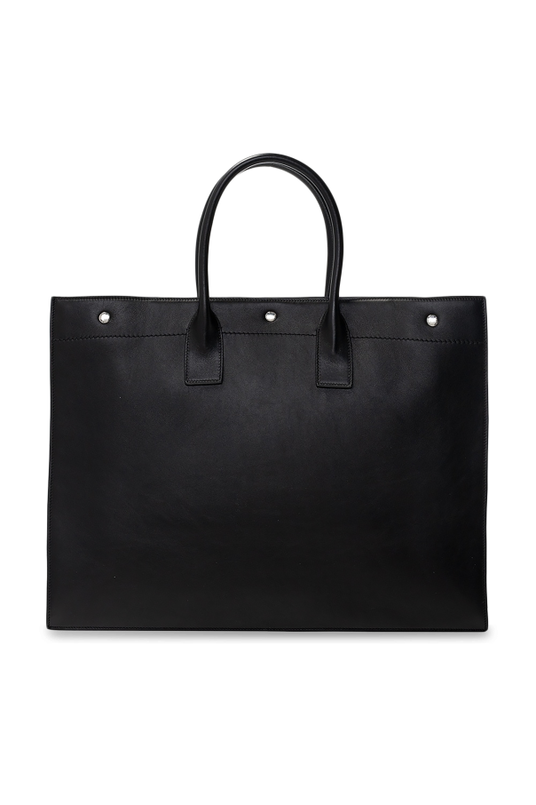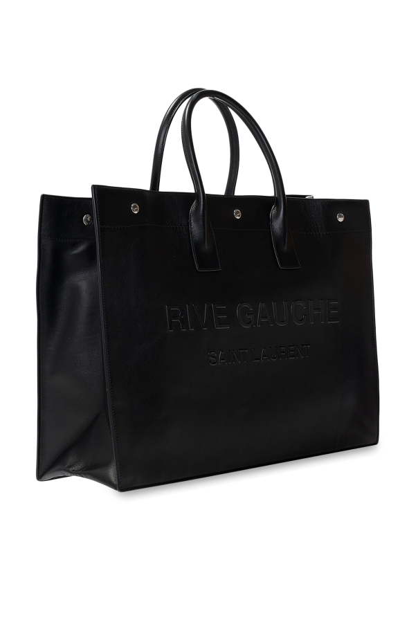 Black ‘Noe’ shopper bag from Saint Laurent. Size large. Crafted from calf leather, this design fastens via snap-buttons and showcases a black an embossed logo on the front. Two half-round handles in leather, silver-tone metal hardware, one main internal compartment with a zipped pocket and magnetic tabs increasing the item\'s capacity on the sides complete the look.