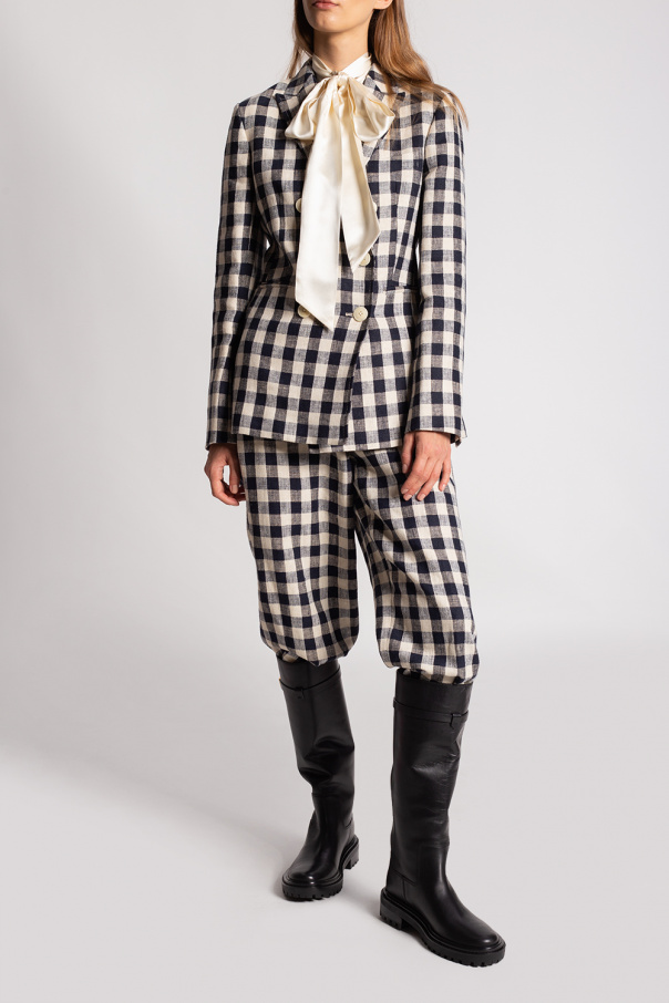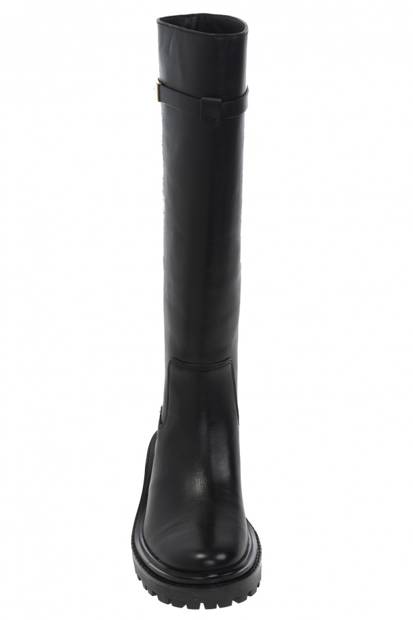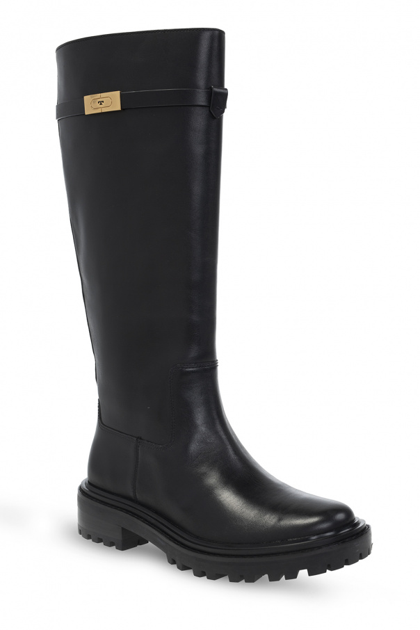 Black boots from Tory Burch. Crafted from calf leather with a slip-on silhouette, this model sits on a black rubber sole and showcases a gold-tone logo appliqué on the side.