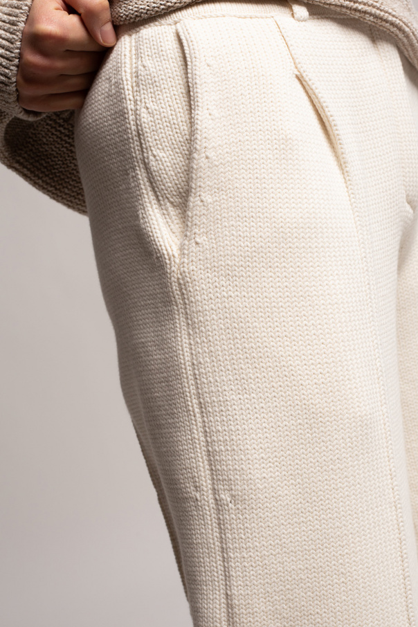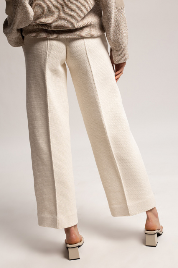 Cream knit trousers from Fendi. This straight leg design features two slip pockets and fastens with a zip, snaps and a button.