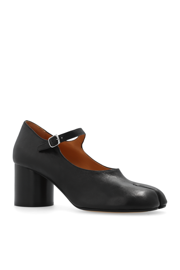 Black pumps from Maison Margiela. Crafted from leather, this model sits on a beige leather sole and showcases the signature Tabi split-toe, inspired by the traditional 15th century Japanese sock bearing the same name, launched for the brand\'s debut collection in 1989. It is complete with an adjustable strap with a silver-tone buckle.