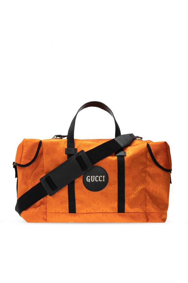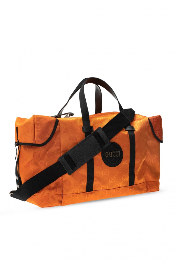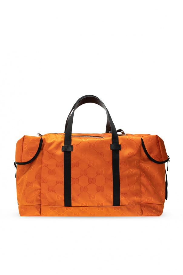 Orange duffel bag from Gucci, the ‘Off The Grid’ collection. Crafted from the innovative ECONYL material, this item features an all-over GG pattern in jacquard, black leather trims, zip closures, two slip flap pockets with strap closures on the sides, two half-round handles, a detachable shoulder strap and one internal compartment. This item was entirely produced from recycled, organic and sustainable sourced materials. It comes with a FSC-approved recycled gift box. Each product from the Gucci ‘Off The Grid’ collection will be shipped with a dedicated booklet describing the collection, printed on FSC-certified recycled paper.