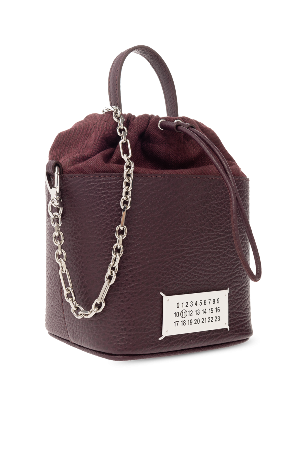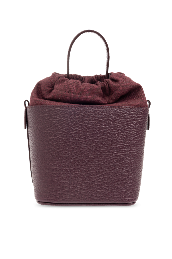 Maroon ‘5AC Small’ shoulder bag from Maison Margiela. Made of grained calf leather and cotton canvas, this design is complete with drawstrings, a white logo patch, half-round handle, detachable shoulder chain, silver-tone metal hardware and one internal compartment with one slip pocket.
