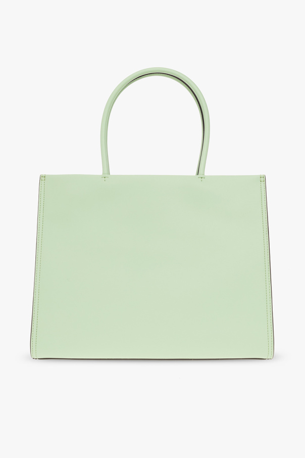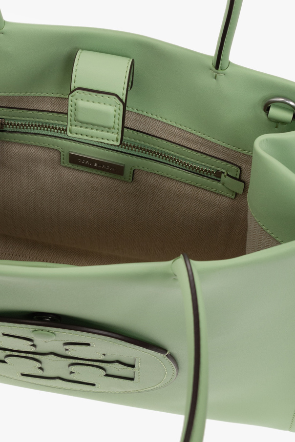Light green ‘Ella Bio Small’ shopper bag from Tory Burch. Made of BioFabbrica Bio-Tex™ vegan leather, this model fastens with a magnetic snap and features snaps on the sides, front pocket with a logo, two half-round handles, detachable and adjustable shoulder strap, silver-tone metal hardware and one internal compartment with one slip pocket and one zip pocket.