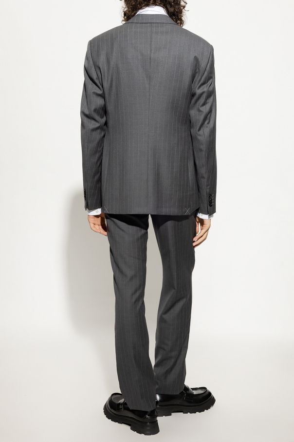 Grey suit from Giorgio Armani. Made from wool with fine pinstripes all-over, this ensemble includes a single-breasted blazer with a single button closure, notch lapels, three slip pockets, a double back vent and long sleeves with button cuffs as well as trousers which fall with slightly tapered legs and employ a zip fly with a button, two front slip pockets and two back button pockets.