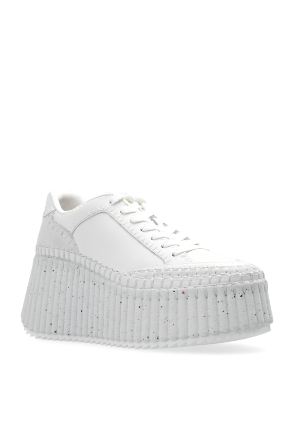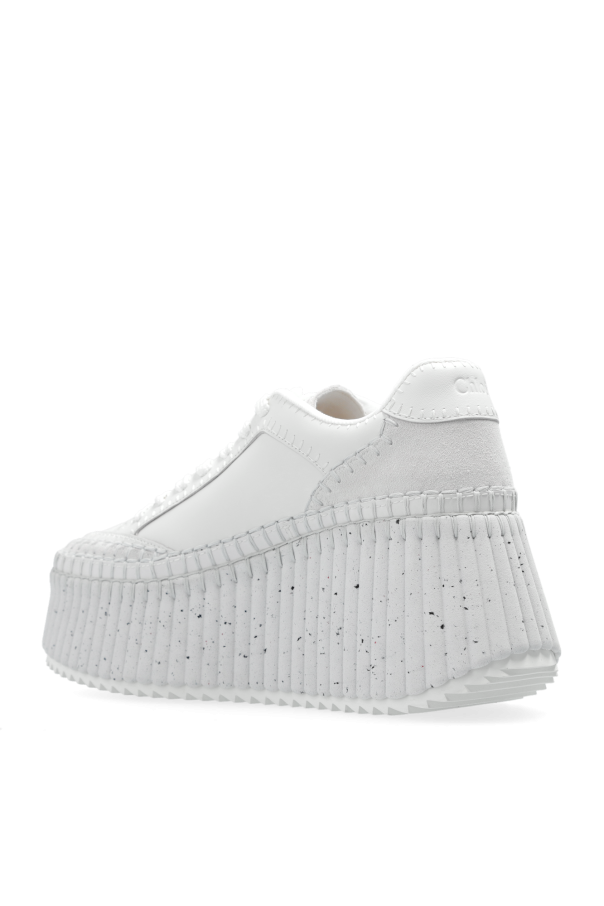 White ‘Nama’ platform sneakers from Chloe. Made from leather and suede with the LWG certificate, this lace-up model sits on a white rubber sole and showcases the brand\'s logo and decorative stitching details.