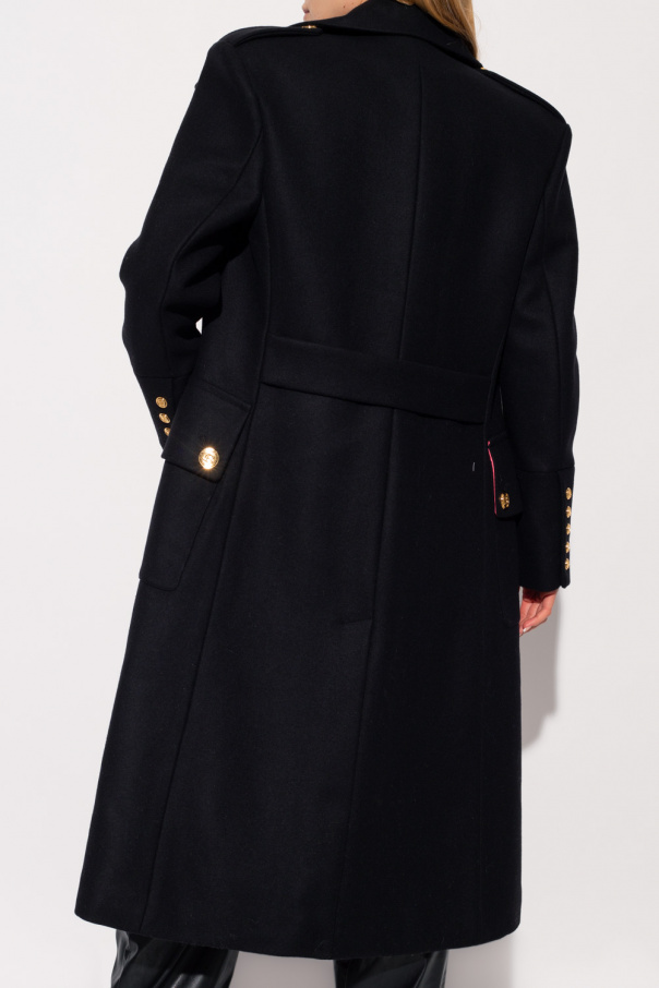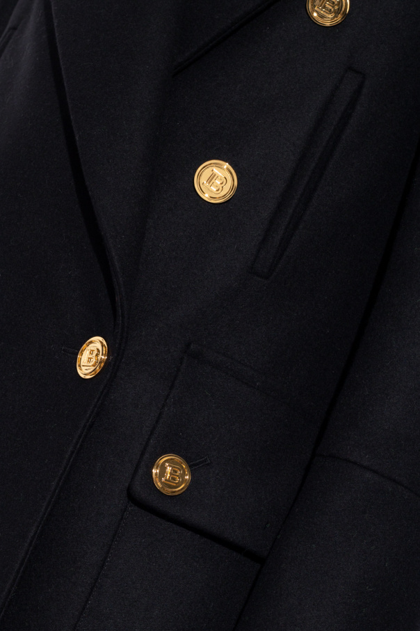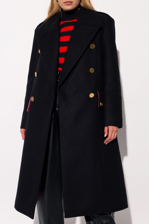 Black coat from Balmain. Crafted from wool with a double-breasted silhouette, this style features button fastenings, epaulettes on the shoulders, two slip pockets and two flapped pockets with buttons on the front, a single back vent, gold-tone metal hardware and a pink quilted lining.