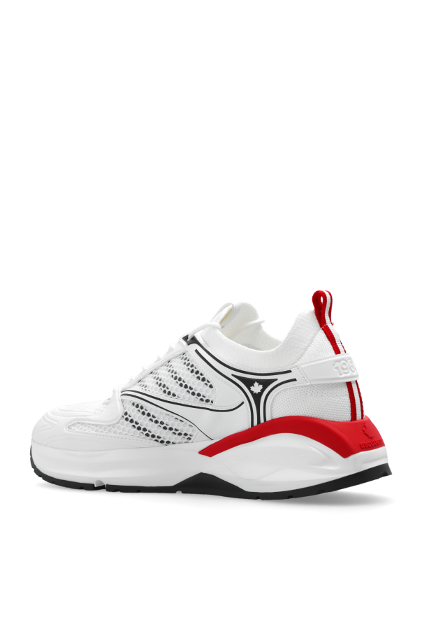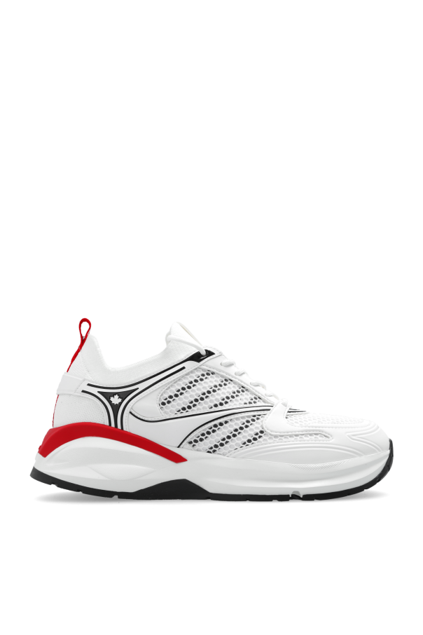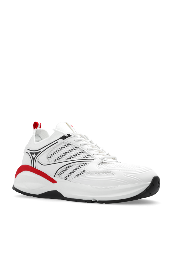 White sneakers from Dsquared2 x Dash. Crafted from fabric and rubber with a slip-on silhouette, this lace-up model sits on a black and white rubber sole and showcases the brand\'s logo, mesh overlays and black and red inserts.
