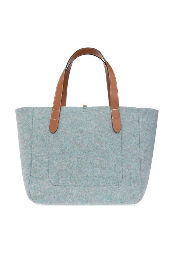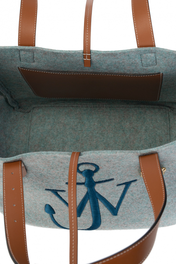Gray and blue shopper bag \'Belt\' from J.W. Anderson. Made of recycled materials. Decorated with an embroidered logo pattern. Two semicircular handles. One compartment and a slip pocket inside. Brown leather trim.