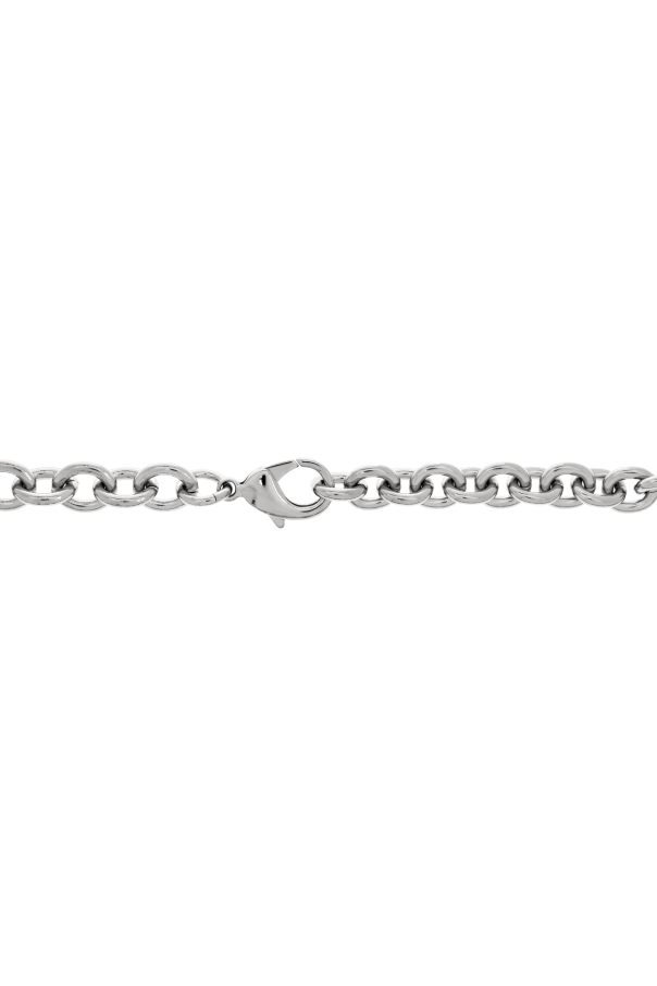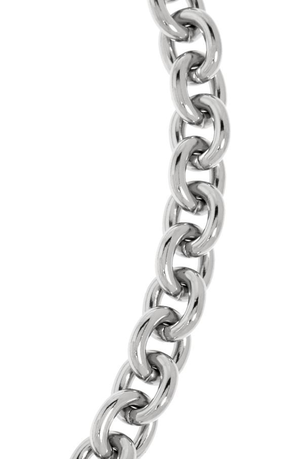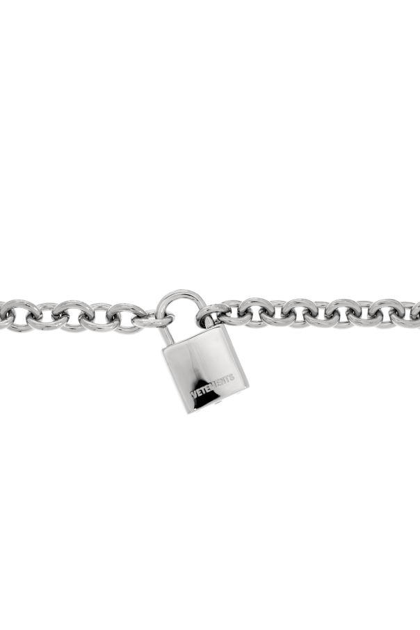 Introducing the Brass Necklace by VETEMENTS, a masterpiece of contemporary men\'s jewelry. Crafted from premium brass, this necklace showcases a robust chain of interlinked round links, culminating in a striking padlock pendant that serves as its centerpiece. The necklace boasts a silver hue, lending it an air of timeless elegance and versatility. The padlock, adorned with the designer\'s logo, adds a touch of distinction, while the classic lobster clasp ensures ease of wear. Renowned for their androgynous and bold designs, VETEMENTS\' creative team has imbued this piece with their characteristic flair, drawing inspiration from 90s street style. This necklace not only reflects the brand\'s avant-garde ethos but also serves as a statement accessory for the modern man. Why Choose This Product? Exquisite Craftsmanship: Made from high-quality brass for a solid and elegant look. Unique Design: Features a distinctive padlock pendant with the designer\'s logo. Versatile Elegance: Silver color offers timeless appeal suitable for various occasions. Ease of Use: Equipped with a classic lobster clasp for effortless wearing.
