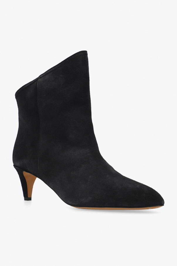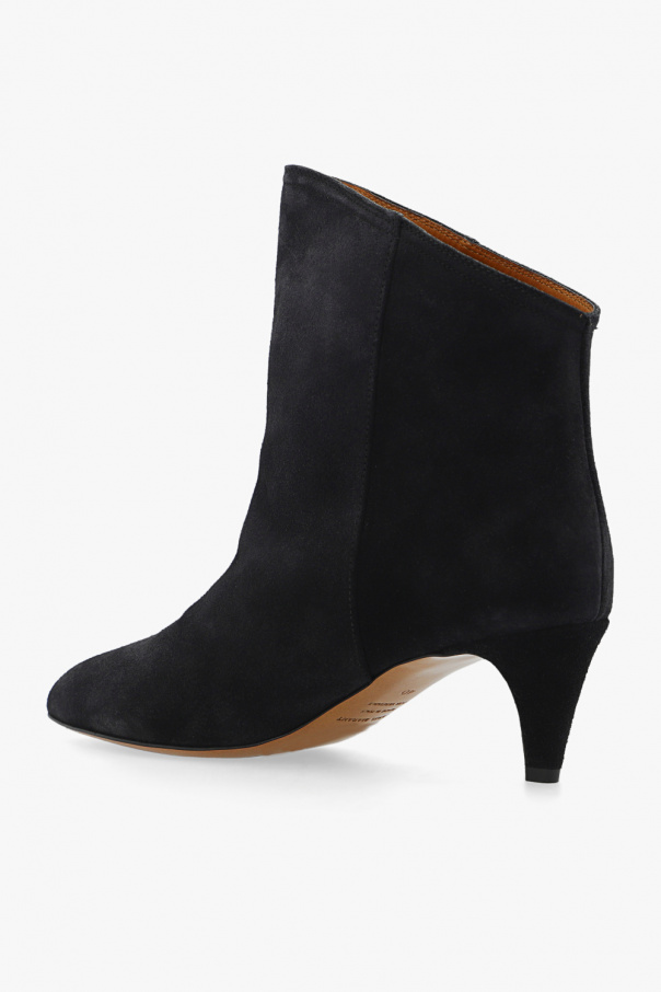 Navy ‘Dripi’ heeled slip-on ankle boots from Isabel Marant. Crafted from calf suede, this slip-on pair features an asymmetric upper, pointed toe and beige leather sole.