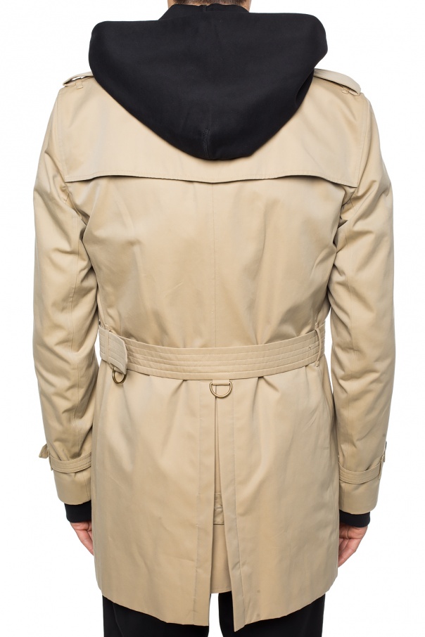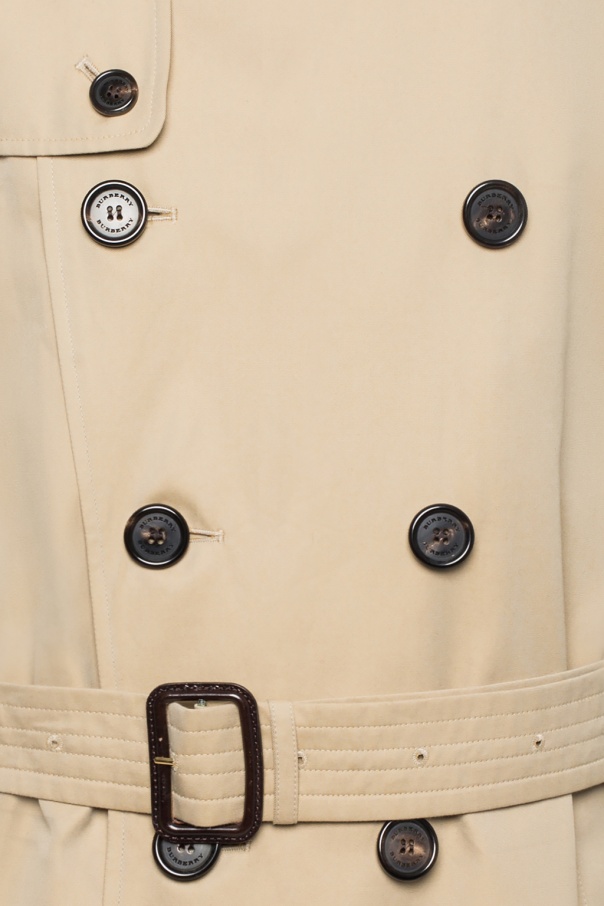 Beige cotton medium-length double-breasted trench coat from Burberry. Button fastening. Epaulettes on the shoulders. Two button pockets. Cuffs with adjustable buckle. Single vent at the back with button. Buckle waistband.