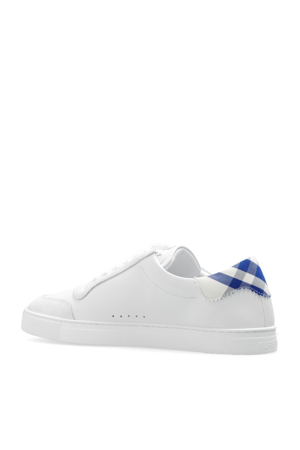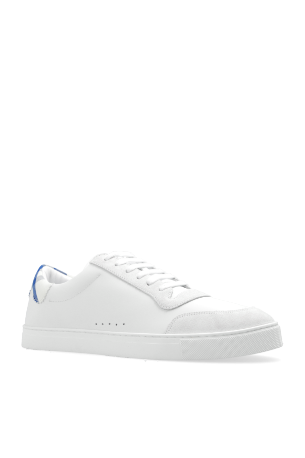 White ‘Robin’ sneakers from Burberry. Made of leather and trimmed with suede, this lace-up model sits on a white rubber sole and showcases a heel counter with a white and blue check pattern.
