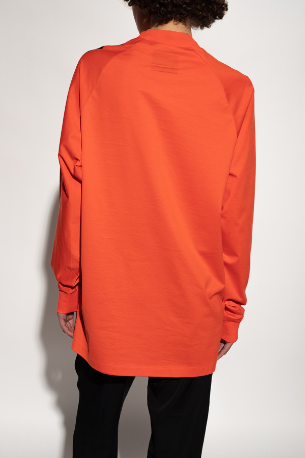 Orange crewneck T-shirt from Y-3 Yohji Yamamoto. Crafted from cotton with an oversize fit, this style features a mock neck, long sleeves with elasticated cuffs, a printed black logo on the front and the brand\'s signature three black stripes applied on the shoulders.