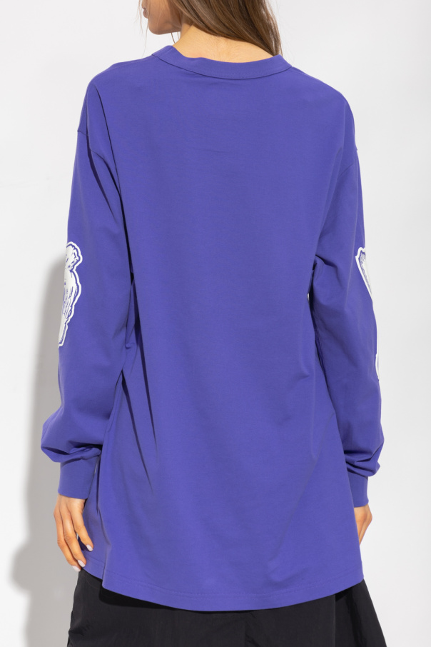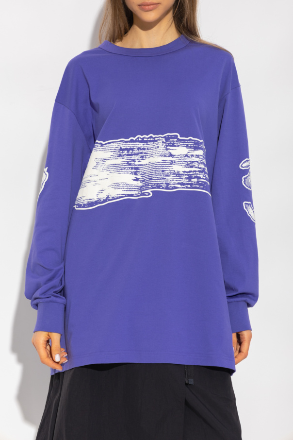 Purple crewneck T-shirt from Y-3 Yohji Yamamoto. Crafted from cotton with an oversize fit, this style features a graphic print on the front, rubberised white logo detailing on the shoulders and ribbing on the collar and long sleeves.