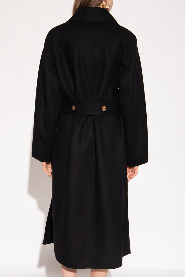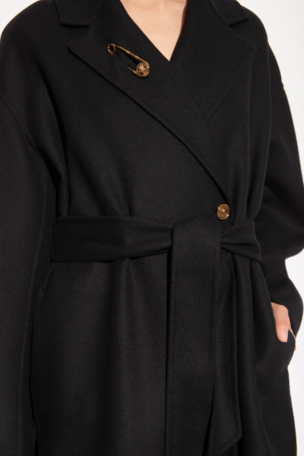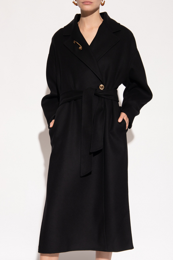 Black single-breasted blazer from Versace. Crafted from wool with an oversize silhouette, this style features a distinctive gold-tone Medusa button, a waist-cinching belt, a collar with notch lapels and a signature safety-pin, two slip pockets, dropped shoulders, and long sleeves.