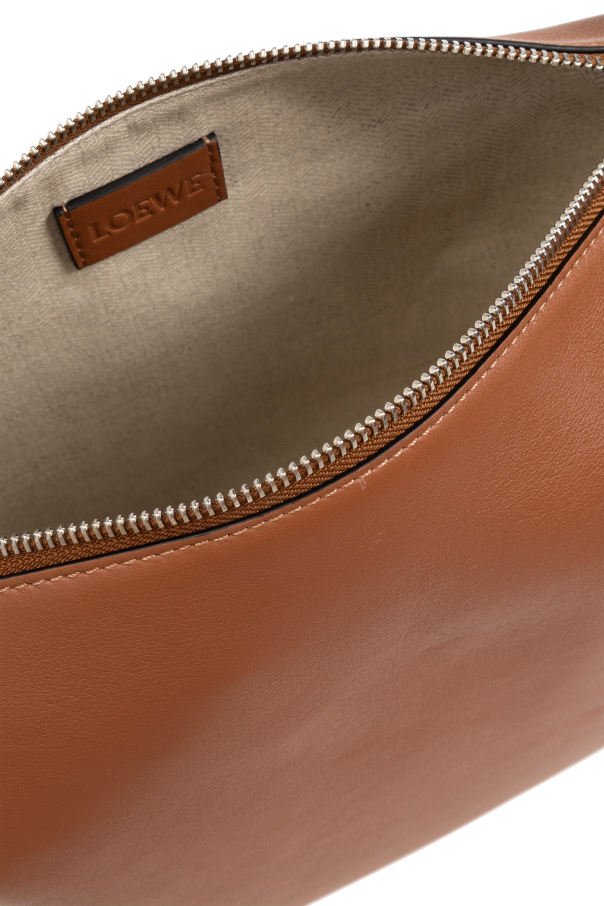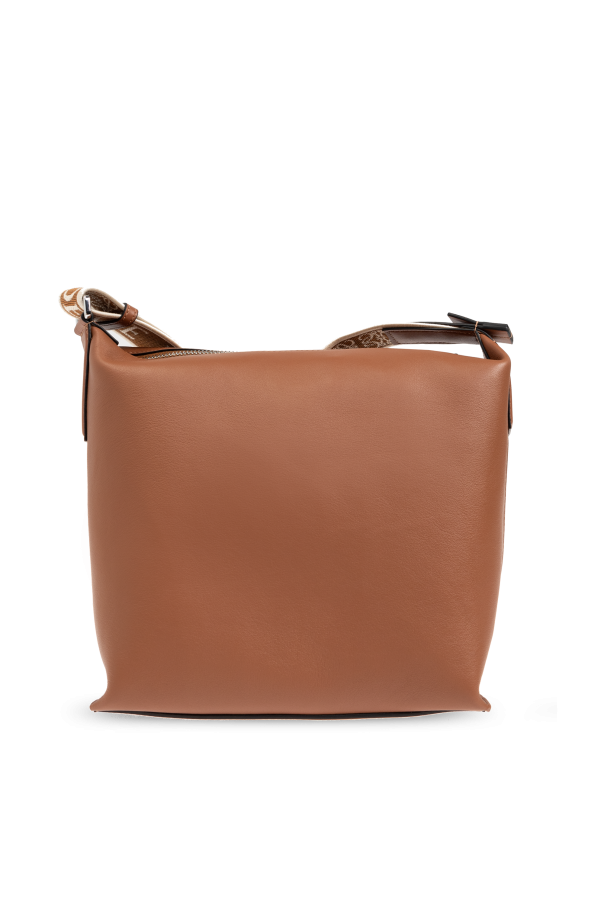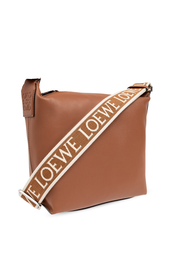 Introducing the \'Cubi Small\' shoulder bag by the esteemed brand Loewe. This luxurious accessory exudes sophistication and practicality, making it a quintessential addition to any discerning wardrobe. The bag boasts a rectangular, compact shape with subtly rounded edges, crafted from premium smooth leather in a rich brown hue. The wide shoulder strap, adorned with the repeated \"LOEWE\" motif in white letters and trim, adds a bold statement while ensuring comfort and versatility. Secured with a zipper closure, the \'Cubi Small\' guarantees the safety of your belongings. Inside, the bag is lined with a light-colored, durable fabric, complemented by a small leather patch featuring the Loewe logo. This intricate attention to detail showcases the brand\'s dedication to superior craftsmanship. The exterior is further accentuated by an embossed Loewe logo on one side, enhancing its exclusive appeal. Despite its petite size, the bag offers ample space for daily essentials, making it ideal for everyday use. Why Buy This Product? Exquisite design by Loewe High-quality smooth leather Secure zipper closure Comfortable and stylish shoulder strap Compact yet spacious interior Distinctive Loewe logo details
