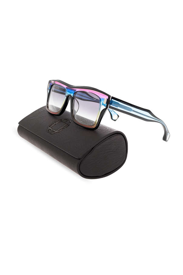 Black ‘Chambers’ square sunglasses from Blake Kuwahara. Handmade in Japan, this pair features a single bridge, integrated nose pads, colourful detailing with a transparent finish, metal applications, temples with a logo based on Blake Kuwahara’s Japanese family crest as well as grey gradient lenses with UV protection. Case included.