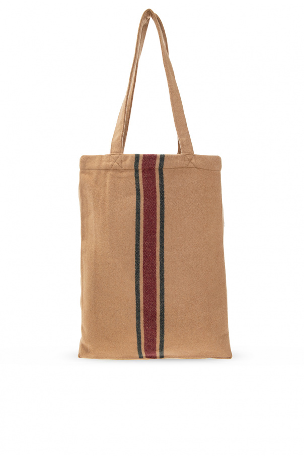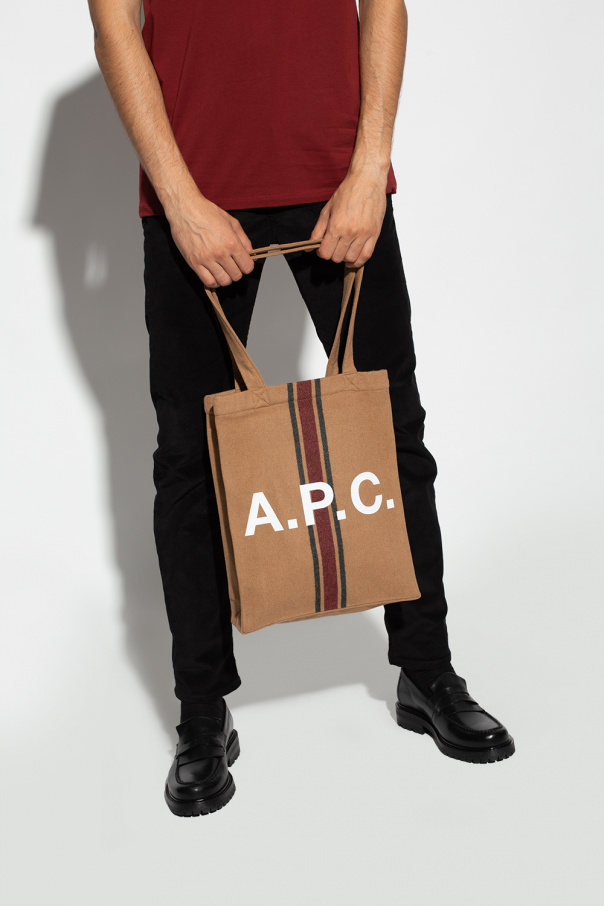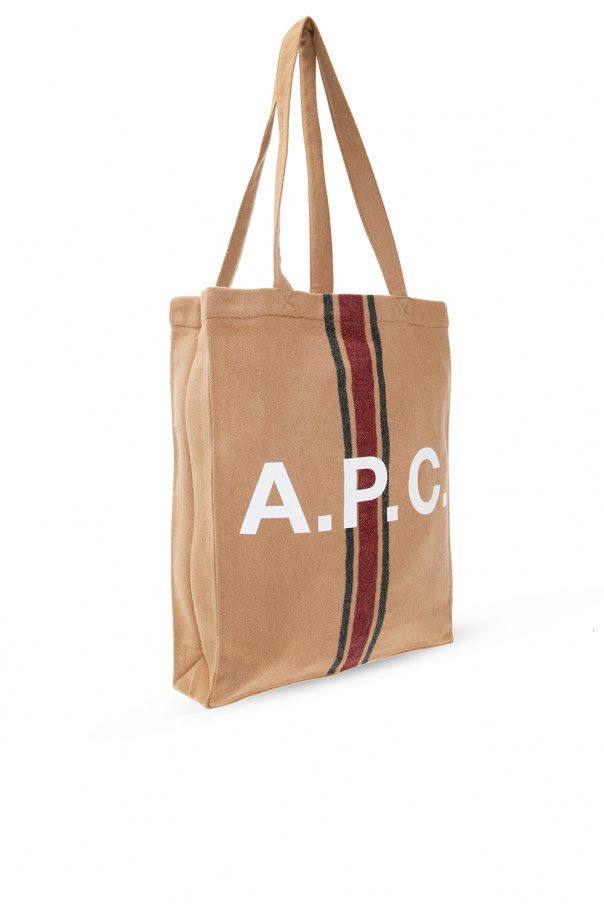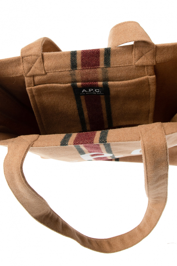 Brown ‘Lou’ shopper bag from A.P.C. Crafted from wool, this design features white logo print, maroon and black stripe pattern, two half-round handles and one internal compartment with one slip pocket.