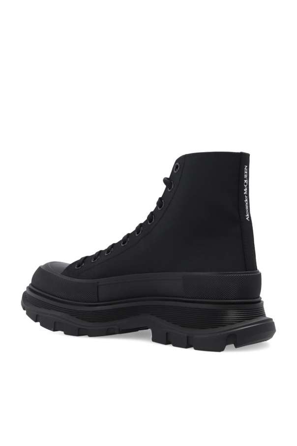 Black quilted high-top platform sneakers from Alexander McQueen. Resting on a black rubber sole, this lace-up pair features a silver-tone logo print on the tongue, white grosgrain pull tab, logo details and a pair of additional laces.
