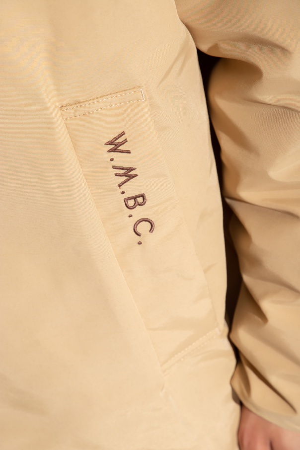 Beige hooded down jacket from White Mountaineering x TAION. Fastened with snaps, this long sleeve design features a brown logo embroidery and two front pockets.
