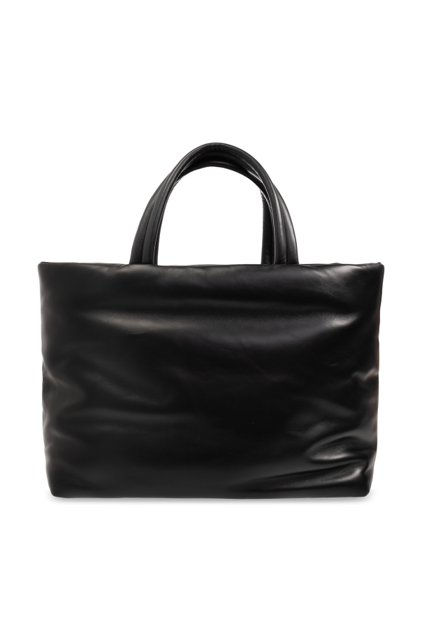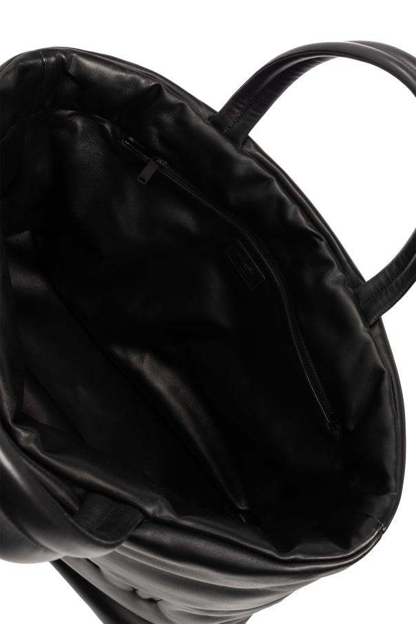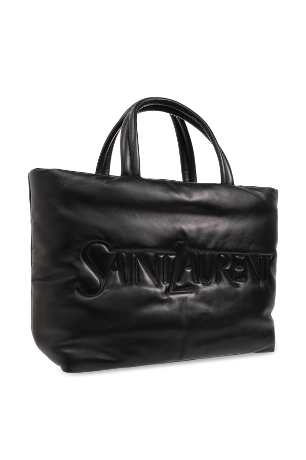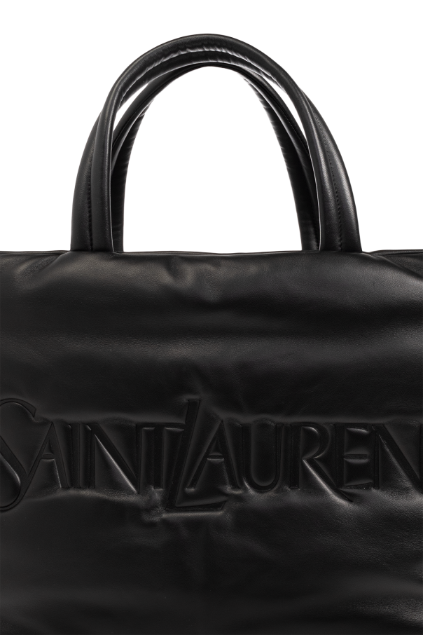 Black shopper bag from Saint Laurent. Made of lamb leather, this design showcases an embossed logo on the front, two half-round handles and one internal compartment with one zip pocket.