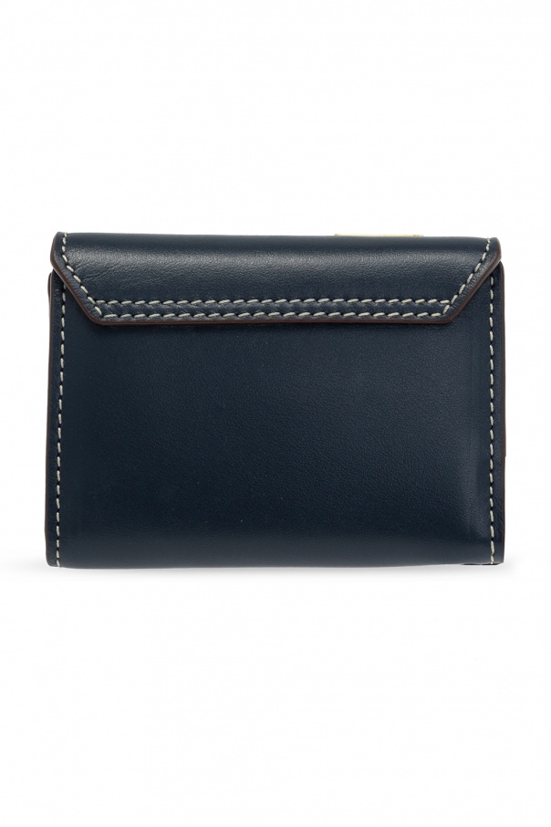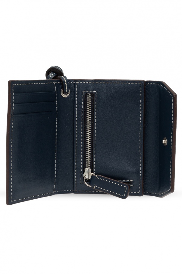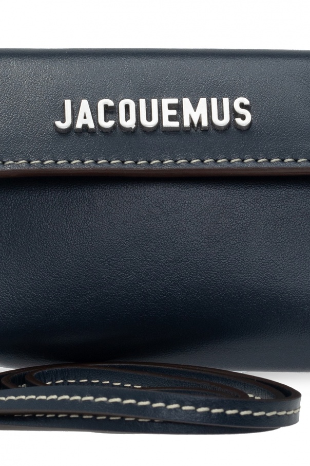 Navy ‘Le Porte’ wallet with straps from Jacquemus. Crafted from leather, this design fastens with a snap and is decorated with a silver-tone metal logo. It has one zipped coin pocket, two slip pockets and three card slots.