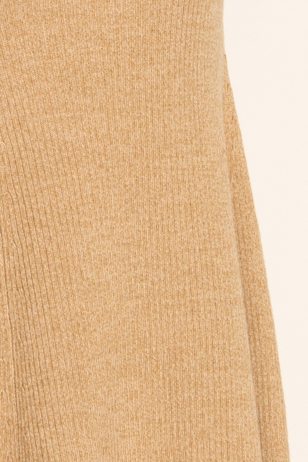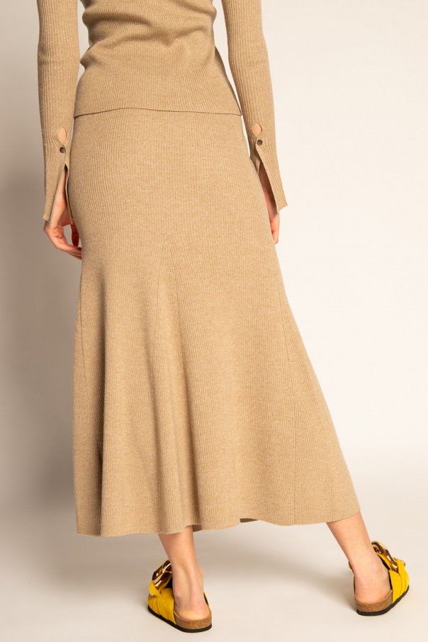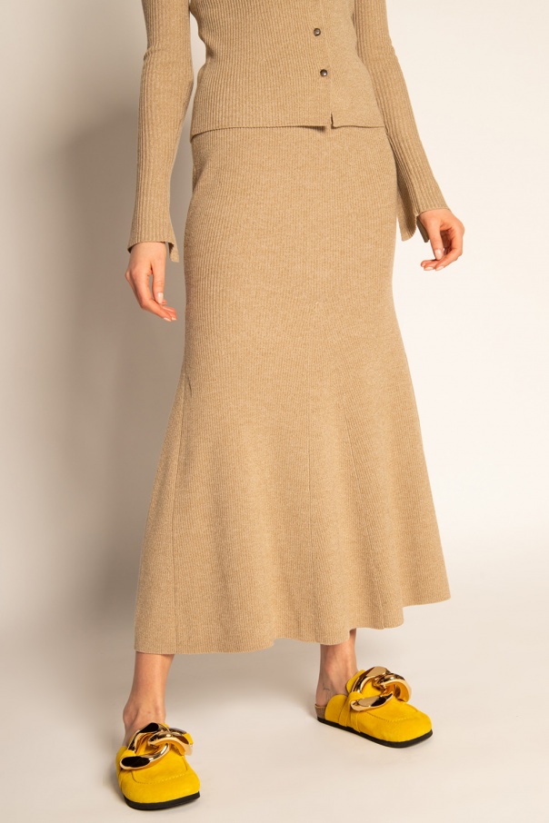 Beige ribbed skirt from Nanushka. Crafted from wool, this flared design features an elastic waistband.