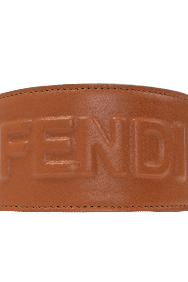 Brown, black and white headband from Fendi. Made of leather, this item showcases stitching details and an embossed logo.
